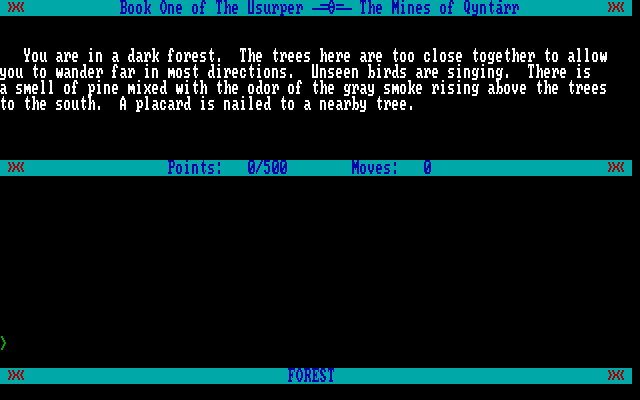 The Usurper: The Mines Of Qyntárr embraces the classic text adventure format, asking you to navigate a perilous forest by typing simple commands like “GO NORTH,” “TAKE TORCH,” or “EXAMINE PEDESTAL.” As you explore, the game meticulously tracks each move and awards you up to 500 points based on discovered locations, solved puzzles, and clever shortcuts. This scoring system adds a layer of strategy, encouraging careful planning and efficient exploration rather than random command entry.