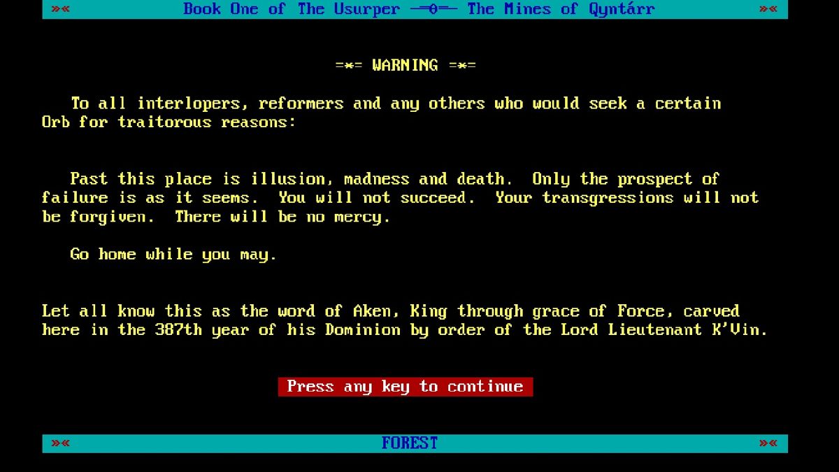 As a pure text adventure, The Usurper: The Mines Of Qyntárr forgoes traditional sprites or 3D models in favor of evocative prose. Descriptions of twisted roots, flickering torchlight, and ominous stone carvings paint vivid mental images, letting your imagination fill in the blanks. This minimalist approach keeps file sizes small and allows for rapid load times even on modest hardware.