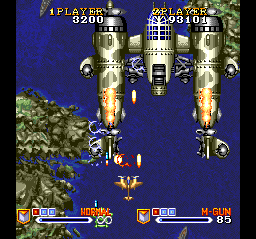 Weapon customization is a key strategic element. Collecting power‐up icons left behind by defeated foes will upgrade your firepower—ranging from spread shots to homing missiles—but these enhanced weapons have limited ammunition. Your baseline cannon remains unlimited, ensuring that you’re never stripped of offense entirely. Holding down the fire button charges a special shot whose potency and pattern vary depending on the current upgrade, adding a satisfying layer of tactical depth.