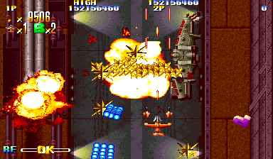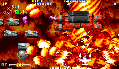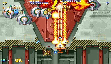 Visually, Giga Wing stands out as an impressive showcase of late-’90s arcade artistry. Each aircraft and enemy sprite is crisply rendered, with bold color palettes that pop against dark, foreboding backdrops. The stages range from industrial complexes to ancient ruins, each brimming with fine details like rotating gears, cascading waterfalls, or eerie temple relics. These backgrounds scroll smoothly at full speed, maintaining fluidity even when the screen is drenched in bullets.