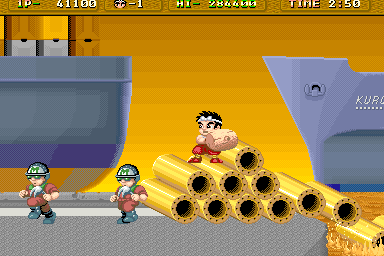 Taking full advantage of the hardware capabilities of its era, Hammerin’ Harry sports vibrant, cartoon-inspired visuals that still hold charm today. Each environment features a distinct color palette: dusty yellows and rust reds on the construction site, murky greens and browns in the sewer, deep blues and grays across the ship’s decks, and rich purples and golds in the final mansion. This variety ensures every stage feels fresh and encourages you to look forward to what comes next.
