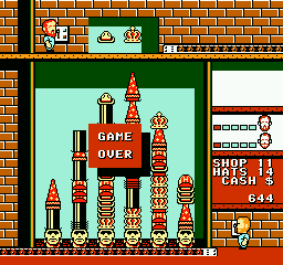 Animation is simple but effective: hats descend smoothly, and the satisfying jingle and drop animations when a stack clears feel rewarding. On the NES, the palette bursts with vivid reds, blues and yellows, giving each shop level its own character. The Famicom version retains this bright presentation, though it omits some of the bonus animations tied to the aid system.