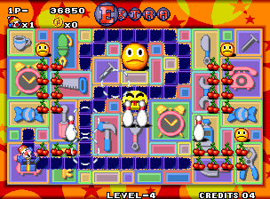 Beyond the power ball, environmental tactics play a critical role. You can tunnel under oversized objects—such as apples or bells—causing them to topple down the screen and crush anything in their path. Timing and placement are key to setting these trap-like ambushes effectively. When all monsters are defeated or lured into traps, a special item appears at the center of the stage. Grabbing it spawns alpha monsters that spell out EXTRA; vanquishing each lettered foe grants you an extra life, offering a thrilling payoff for skilled play.