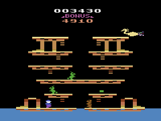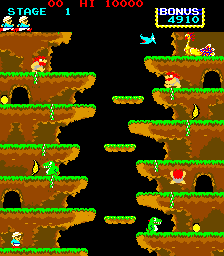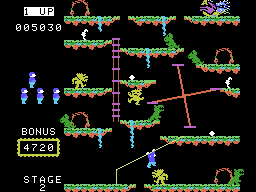 The level timer doubles as a bonus gauge: the quicker you reach the mystical bird perched atop the stage, the more extra points you bank. Collectible treasures glitter on hidden ledges to pad your score, rewarding risk-takers who dare hang from fragile vines or leap across narrow gaps despite the game’s zero-fall tolerance.