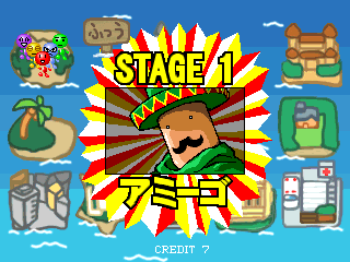 Visually, Tecmo Stackers employs bright, vibrant block colors that are easy to distinguish, even as the screen fills up during intense chain combos. The blocks themselves are slightly shaded to give a pseudo-3D effect, making them pop against the photographic backgrounds. This clarity is vital in a fast-paced puzzle game, where split-second decisions hinge on accurately identifying matching colors.