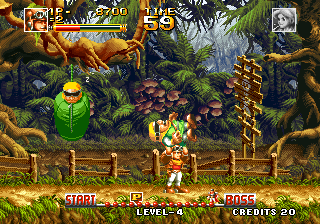 Beautifully rendered in crisp Neo Geo pixel art, Top Hunter’s visuals pop with vibrant colors and detailed character sprites. The backgrounds are lush and varied—towering trees sway in the Forest stage, crystalline spikes gleam in Ice, swirling gusts animate the Wind zone, and molten rivers pulse in Fire. Despite the hardware limitations of the era, each environment feels alive, with animated flora, cascading snowflakes, billowing clouds, and flickering embers adding depth and atmosphere.