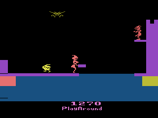 Flip it over to embark on a daring quest as the heroine of Lady in Wading, a gender-reversed take on the cult favorite Knight on the Town. As a courageous lady knight racing through perilous terrain, you’ll face traps, enemies, and a host of challenges on your mission to reach your prince. Identical in design to its counterpart—right down to the risqué ‘reward’ animation—this side offers identical gameplay with a fresh perspective, making this two-in-one cartridge a must-have for retro collectors and adventurous players alike.