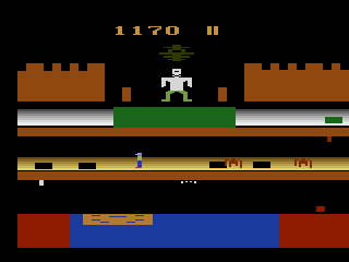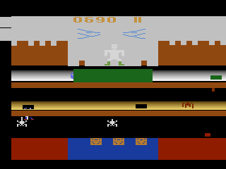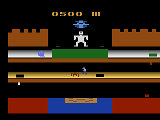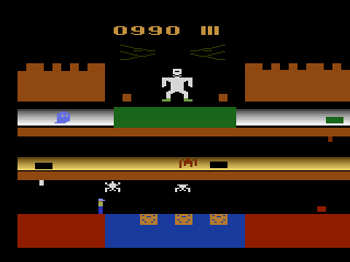 The acid pool shimmers with an unsettling green hue, and subtle animation loops give it a corrosive, bubbling appearance. Trapdoors are demarcated only by thin lines on the floor, demanding sharp player focus. While the visuals are admittedly dated by modern standards, the minimalist design ensures every piece of on-screen information is clear, from remaining time to lives and point tallies.