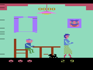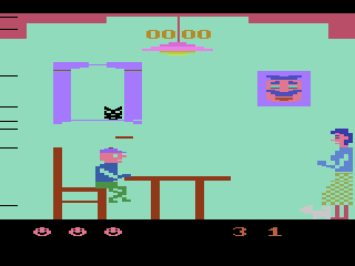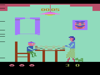 Mangia’ delivers a deceptively simple yet wildly addictive core loop: as Mama brings plate after plate of steaming pasta to the table, you must decide whether to gobble it down yourself or discreetly fling it to Frankie the cat or Sergio the dog. A single move of the joystick to the right then left lets you shovel pasta into your mouth, while a smooth diagonal flick (right/up for the window, right/down for under the table) sends dinner skittering to your furry accomplices. Timing is everything—if Mama catches you in the act of feeding the pets, she’ll raise the stakes with an extra three plates next round.