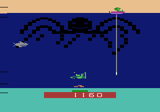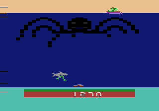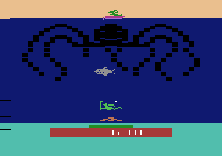 At its core, Name this Game is a tense arcade-style experience where precision and timing are everything. You take command of a lone diver armed with a trusty harpoon, tasked with defending a cache of submerged treasure from relentless threats. The shark prowls the water column above, diving down to snatch precious loot, while the octopus extends its sinuous tentacles, inching ever closer to the seabed. Every shot you fire sends the hunter back into retreat, but come back they will.