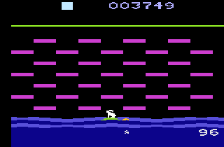 Once safely aboard your turtle, you’re whisked off to The Land of Ledges, where the action shifts to a color-changing puzzle reminiscent of Q*Bert. Each hop toggles the hue of a platform, and your goal is to flip every block while evading falling stones dropped by the menacing figure above. Late-game levels introduce mechanics that reverse your progress, making each ascent more strategic and demanding precise routing to avoid re-doing sections you’ve already cleared.