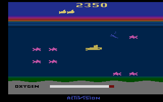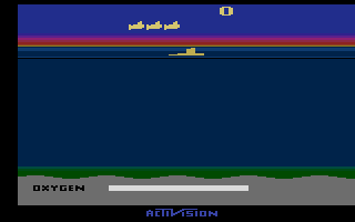 Though rooted in classic arcade aesthetics, Seaquest’s visuals remain crisp and colorful. The deep-blue ocean backdrop provides excellent contrast against the bright yellow of the submarine and the red-and-white diving suits of your passengers. Every sprite is well-defined, ensuring you can quickly spot hazards even when the screen fills up.