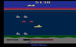 Seaquest’s core loop is brilliantly simple yet increasingly demanding. You pilot a nimble submarine beneath the waves to collect up to six divers per run, ferrying them safely back to the surface before your oxygen meter runs out. The tension of juggling oxygen levels with the constant threat of giant sharks and enemy subs keeps every dive fresh and engaging.