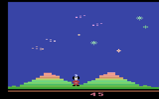 Sorcerer’s Apprentice delivers a straightforward yet addictive gameplay loop centered on Mickey Mouse’s frantic efforts to stave off the water-drenched chaos unleashed by the enchanted brooms. Players guide Mickey across a series of mountaintop platforms, catching falling stars and shooting meteors back at incoming broom hordes. Each star collected spawns a bucket, which Mickey must strategically deploy to drain rising water from the Sorcerer’s cavern below. The core objective is elegantly simple, but the pacing and increasing threat of the brooms keep the action engaging.