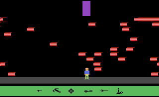 Considering SwordQuest: EarthWorld was built for the Atari 2600, its visuals are surprisingly evocative. The game uses bold, flat color blocks and simple geometric shapes to distinguish rooms, doors, and hazards. While primitive by modern standards, the art style communicates key information clearly—you always know where items sit, where exits lead, and how to recognize enemy patterns in action stages.