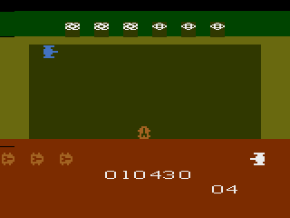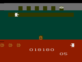 Adding to the challenge is a relentless Sentry tank hovering at the screen’s bottom, inching closer to your reserve tanks with every passing moment. If it reaches you before all six bases are destroyed, you lose a life, adding a powerful tension that lingers even when you’ve momentarily eluded the other guards. Lives are finite, and losing them all brings a swift end to your mission, demanding both precision and speed from the player.