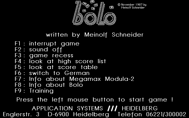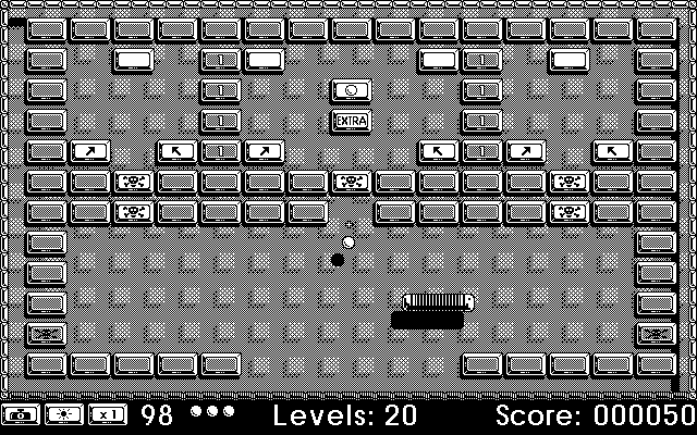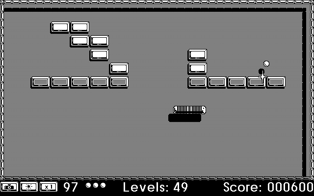 Bolo’s visuals are rendered entirely in black and white, a deliberate choice that emphasizes clarity over flashy effects. While the game supports both monochrome and color monitors, it truly shines on monochrome displays, where the crisp lines and stark contrasts make every brick and ball movement exceptionally easy to track. On color screens, subtle grayscale dither patterns still preserve legibility but can feel less defined by comparison.
