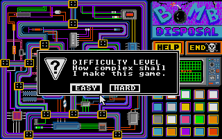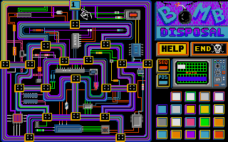 Bomb Disposal’s visuals are rooted in the GFA Basic 3 era, delivering a stark, retro aesthetic that emphasizes function over flair. The game window presents a grid of twenty sockets, each clearly outlined, with diodes rendered as simple colored bars labeled by number. There’s no attempt at photorealism or advanced shader effects—everything is deliberately minimalistic.