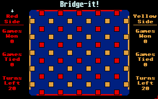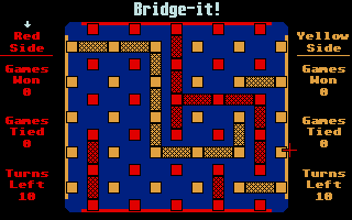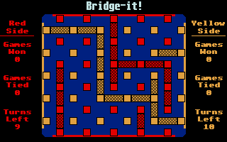 Visually, Bridge-it! embraces retro charm. The entire experience unfolds on a straightforward grid, with red and yellow squares delineating each player’s territory. Bridge pieces appear as solid colored lines bridging adjacent squares, providing immediate clarity on the evolving board state. While there are no flashy animations or particle effects, the crisp, blocky graphics deliver exactly what’s needed—uncluttered focus on the game at hand.