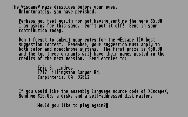 Despite its retro roots, Escape feels remarkably fresh. The blend of assembler-coded performance, strategic inventory management, and procedurally varied maze layouts creates a deeply replayable experience. Every session unfolds differently, thanks to randomized trap placements and monster spawns, so even veteran explorers can look forward to new surprises.