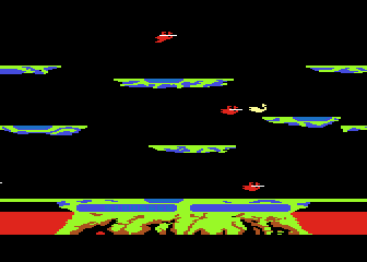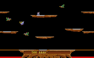 Joust places you in the saddle of a winged steed—an ostrich for Player 1 or a stork for Player 2—as you flap your way through precarious platforms to face off against computer-controlled enemy knights on vultures. The core mechanic revolves around mastering your mount’s wing flap: tapping the button to ascend or ascending while steering to collide with foes from a superior altitude. Successfully striking an opponent from above causes both rider and vulture to dismount, sending an egg tumbling toward the platforms below.