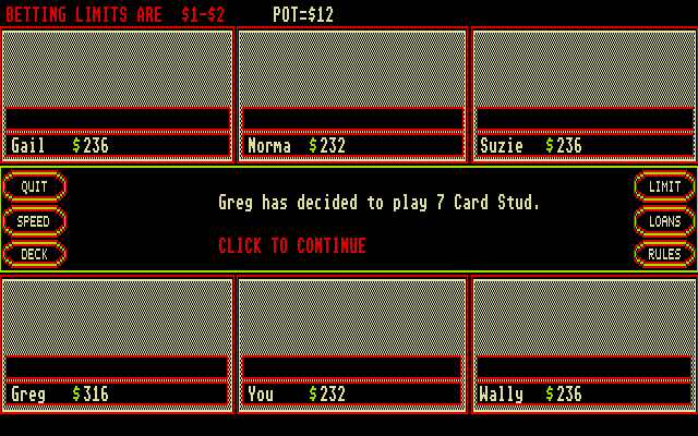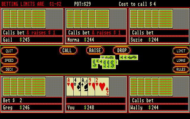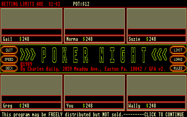 Built in GFA Basic with a medium resolution palette, Poker Night’s visuals are functional and straightforward. The table layout is uncluttered: a green felt field, crisp card sprites, and simple chip stacks let you focus on the action without unnecessary distractions. Although you won’t find high-definition textures or 3D rendered characters, the minimalist presentation is refreshing.