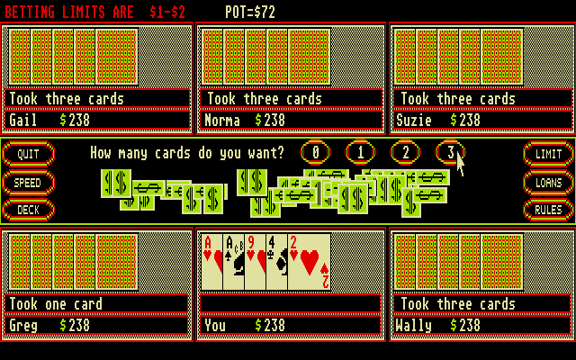 Poker Night places you at a virtual table facing five computer opponents, each starting with $248 in cash. The core of the experience lies in classic poker mechanics—your goal is to outwit the AI players through careful betting, bluffing, and reading the table. With each hand, the dealer randomly selects between 5-card draw, 5-card stud, or 7-card stud, ensuring the gameplay rhythm never grows stale.