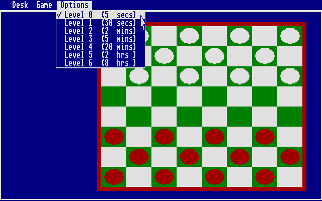 Where ST Checkers really shines is in its seven-tiered difficulty system. Rather than simply speeding up or slowing down the AI, each level adjusts the maximum thinking time allotted to the computer. Beginners can jump in at Level 0, where the AI thinks for a brisk five seconds per move, while seasoned veterans can challenge themselves at Level 6, where the computer may ponder for up to eight hours before committing to its next step. This unique approach ensures that every match feels fair and intellectually stimulating.