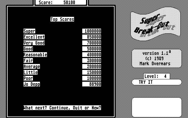 Super Break-Out strikes an excellent balance between nostalgic simplicity and modern innovation. Its core mechanics remain true to the arcade classic—just you, a paddle, and a ball—while the inclusion of monsters, varied brick types, and robust power-ups keeps gameplay consistently engaging. The option to continue from the last level softens the learning curve, yet ambitions players can still challenge themselves to reach new highs without continues.