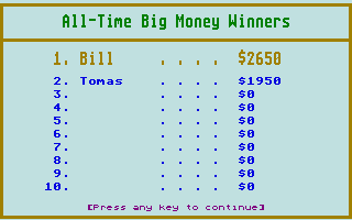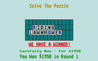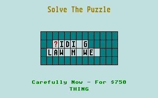 As a GFA Basic title, Wheel of Fortune features simplistic 2D graphics that prioritize clarity and functionality over flashy effects. The puzzle board is neatly rendered with blocky letters that light up as you correctly guess them, offering immediate visual feedback. While the visuals are not cutting-edge, they serve the game’s core mechanic well, ensuring that puzzles remain legible even during fast-paced rounds.