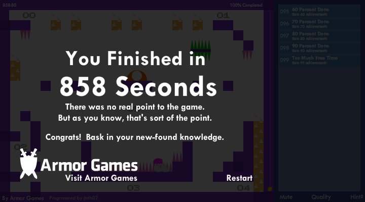 Achievement Unlocked offers an addictive loop for completionists and meta-gaming enthusiasts. The drive to discover each hidden milestone keeps you clicking and jumping long after initial curiosity fades. Even simple achievements provoke a sense of satisfaction that’s surprisingly potent.