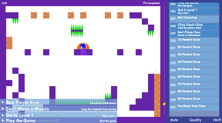 Level design uses simple geometric patterns and a repeating tile set, creating a deceptively uniform environment. This design choice reinforces the game’s message: the environment itself isn’t the point, the achievements are. Yet subtle visual cues—like background animations or hidden alcoves—can hint at secret achievements waiting to be found.
