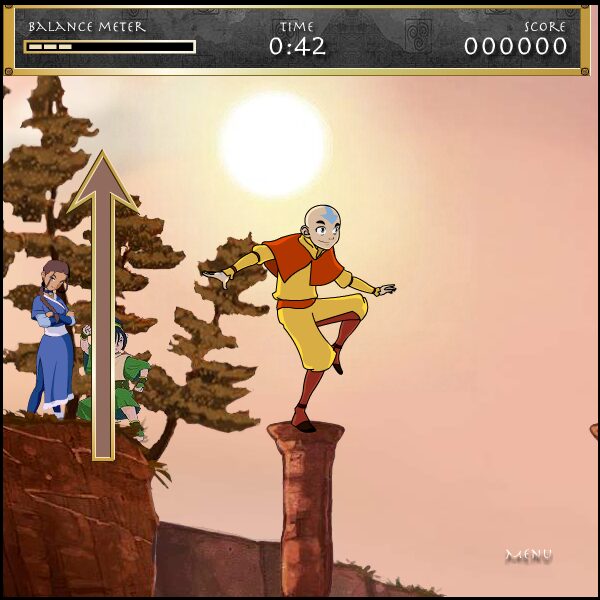 The mini-games themselves are rendered in a clean, 2D Flash aesthetic. Backgrounds are detailed when needed—for example, the treetop setting in “Treetop Trouble” features layered forest imagery—while character sprites remain crisp and faithful to the source material. Special effects, such as swirling air currents or crackling flames, are bright and readable, helping players track their bending powers in real time.