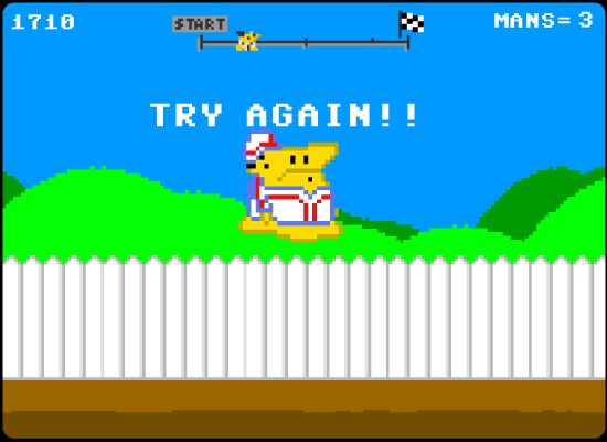 The character and obstacle sprites are rendered with just enough detail to convey personality without overwhelming the simple gameplay. The Cheat’s Tire rolls across the screen with a satisfying wobble, and each obstacle—be it a flying box or a rampaging General Tso’s Chicken—has its own distinct animation. There’s a playful looseness to the visuals, from syrup splatters that linger on the track to explosive particle effects when you narrowly avoid disaster.