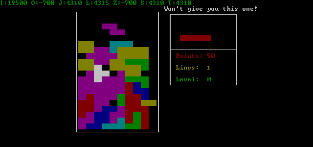 Controls are straightforward—use the arrow keys for horizontal movement, rotation, and soft drop—but the real challenge lies in predicting which problematic piece is coming next. The “Won’t give you this one!” display adds a layer of psychological warfare, taunting you with the shape you’ll never see. This mockery can be frustrating, yet it also motivates you to master your stacking strategy and minimize vulnerabilities in your pile.