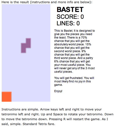 Whether you’re a casual player intrigued by the twist or a seasoned Tetris veteran craving an unforgiving new variant, Bastet delivers endless replay value. Its deceptive simplicity conceals a deep well of strategic possibilities, making each session a fresh test of wits. For anyone seeking a puzzle game that refuses to go easy, Bastet is a must-try.