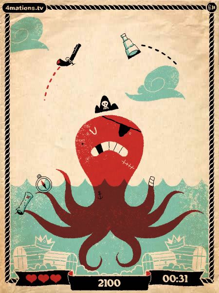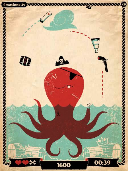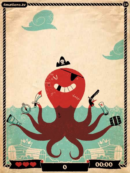 Despite its minimal storyline, Booty Juggler establishes enough context to keep players invested. You are the patched octopus, defending your “booty” from bombs and other falling trinkets. Each heart you catch underscores your struggle for survival, while the occasional fish acts as a lighthearted nod to your aquatic origins. This sparse storytelling approach suits the game’s arcade sensibilities, letting you jump right into the action without wading through cutscenes.