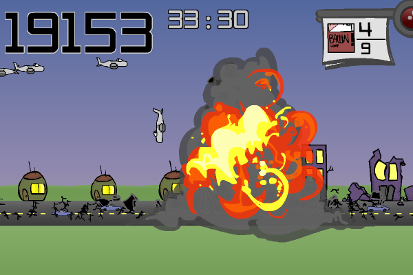 Small details—like panicking stick people scurrying away, automobiles flipping end over end, or airplanes tumbling after a well-placed chunk—add life to the chaos. The city’s skyline and environmental props (streetlights, mailboxes, benches) may be simple in design, but they offer just enough variety to keep each new district from feeling monotonous.
