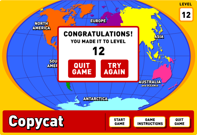 The game’s fifteen levels are carefully calibrated: early stages ease you in with simple two- or three-continent patterns, while later stages demand perfect recall of sequences that span all seven continents. This steady difficulty curve keeps frustration at bay and offers a genuine sense of accomplishment when you finally nail a tough pattern. Copycat’s design encourages repeated playthroughs, as you strive to beat your own high score and master each continent’s unique audio cue.