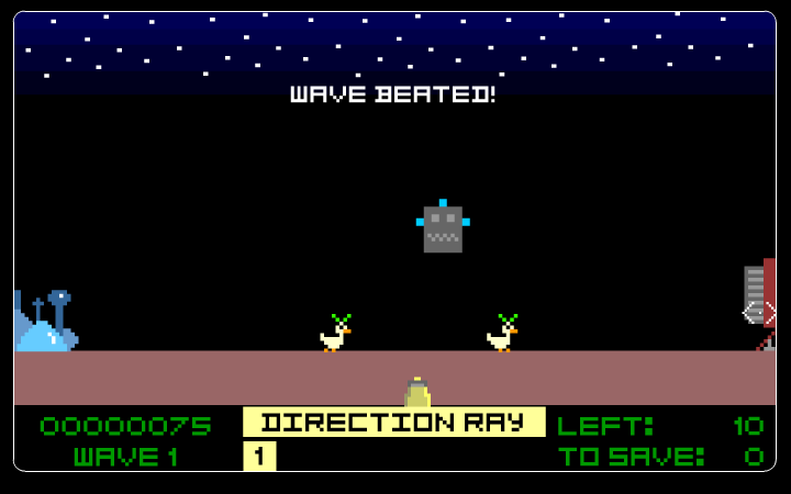 With 33 waves in total, Duck Guardian One ramps up its challenge steadily. You’ll find yourself juggling multiple ducks at once, predicting the random opening and closing of the spaceship door, and ducking out of the way of incoming robot debris. The pacing never drags, and the incremental introduction of new hazards and ray upgrades keeps the experience fresh and addictive.