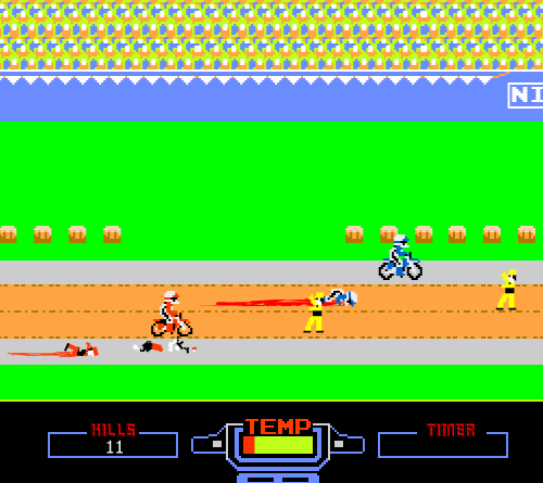 Animations are somewhat limited, but that works in the game’s favor. When you barrel into a hapless official or slam into another racer, the small stall in movement and brief skid effect carry genuine comedic weight. Even the bike’s smoke plume and overheating indicator are portrayed in pixel-perfect simplicity, serving as both a visual cue and a throwback novelty.