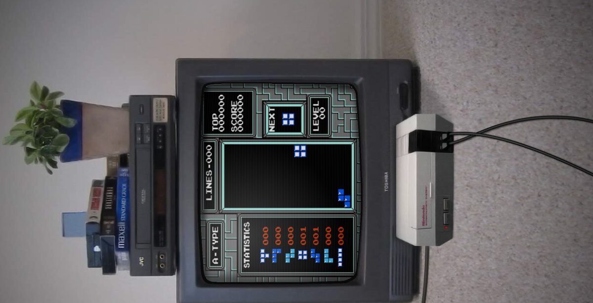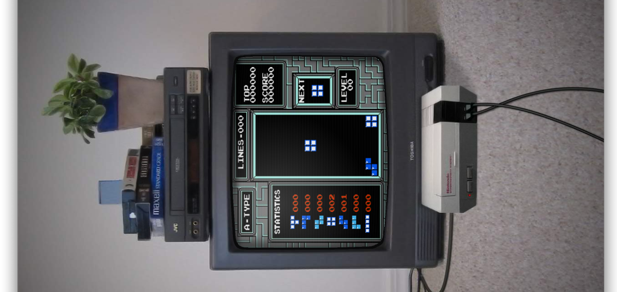 Visually, First-Person Tetris pays homage to the grainy charm of 1980s gaming hardware. The core playfield is rendered as though on an old CRT television, complete with scanlines, flicker, and the slight curvature of a vintage screen. Surrounding that view is a static “rec room” backdrop—an NES console stacked beside a VHS player, posters on the wall, and an analogue television stand—all of which sway and lurch in concert with your block’s movements.