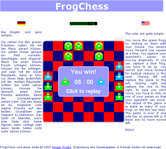 Success in FrogChess relies on a combination of blocking and capturing. By forming tight defensive lines to block oncoming toads and orchestrating flanking maneuvers to remove them via diagonal jumps, you can clear a path for your frogs to advance into the enemy’s endzone. The goal isn’t checkmate but rather having more of your frogs occupy the opponent’s back two rows when the last hop is made.