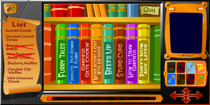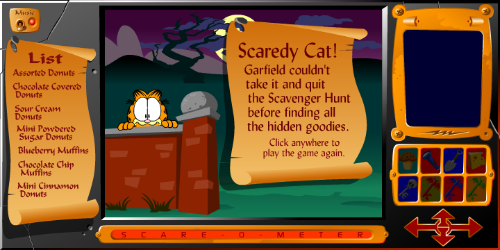 Garfield’s Scary Scavenger Hunt unfolds as a slow-burn exploration title, tasking you with guiding the lasagna-loving feline through a creaky, cobweb-strewn manor in search of seven sugary desserts—chiefly donuts—courtesy of sponsor Perfection Pastries. You navigate Garfield using the arrow keys or by clicking an on-screen directional pad, then investigate hotspots to root out hidden objects. Every nook and cranny can harbor either a helpful tool—like keys or flashlights—or a jump scare that ratchets up Garfield’s “Scare-O-Meter.”