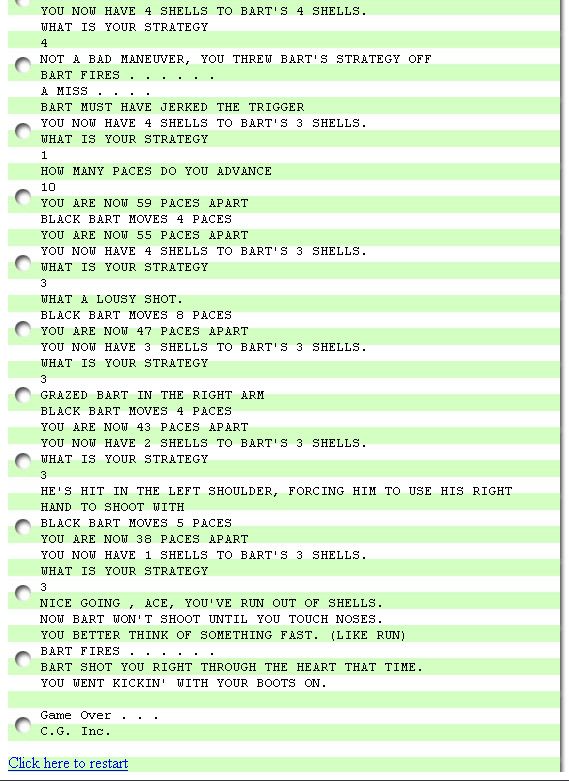 High Noon delivers a deceptively simple yet engaging duel experience. As a text-only Western gunfight simulator, the game unfolds in a series of turns where you and Black Bart face off from 100 paces. With only four shells in your gun, every decision carries weight—advance, fire, take cover behind the trough, run, or surrender. The limited options make each playthrough a tense exercise in risk management and timing.