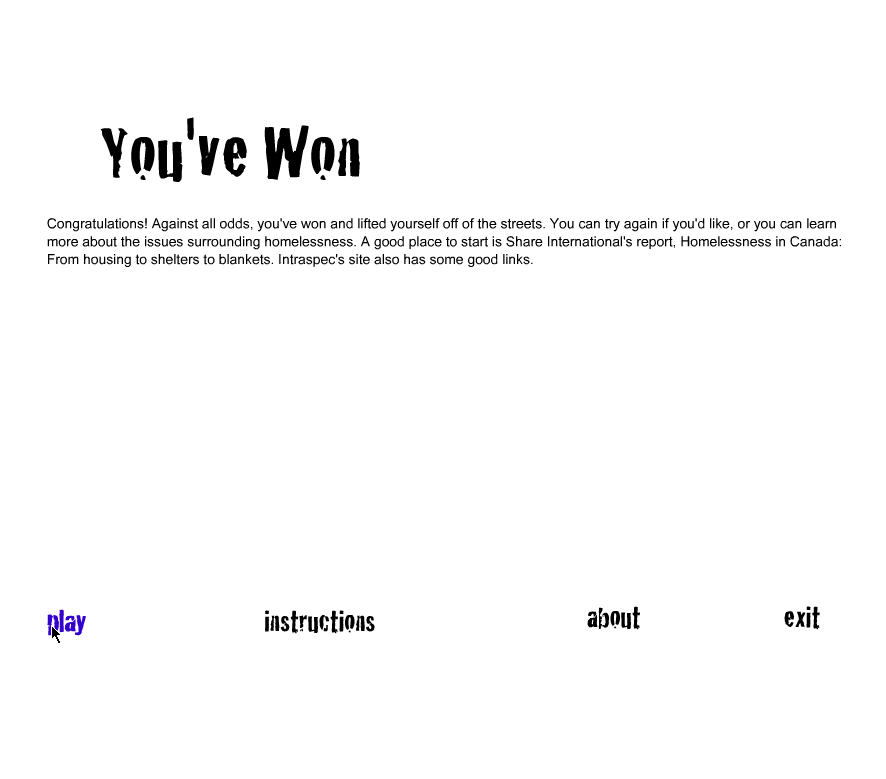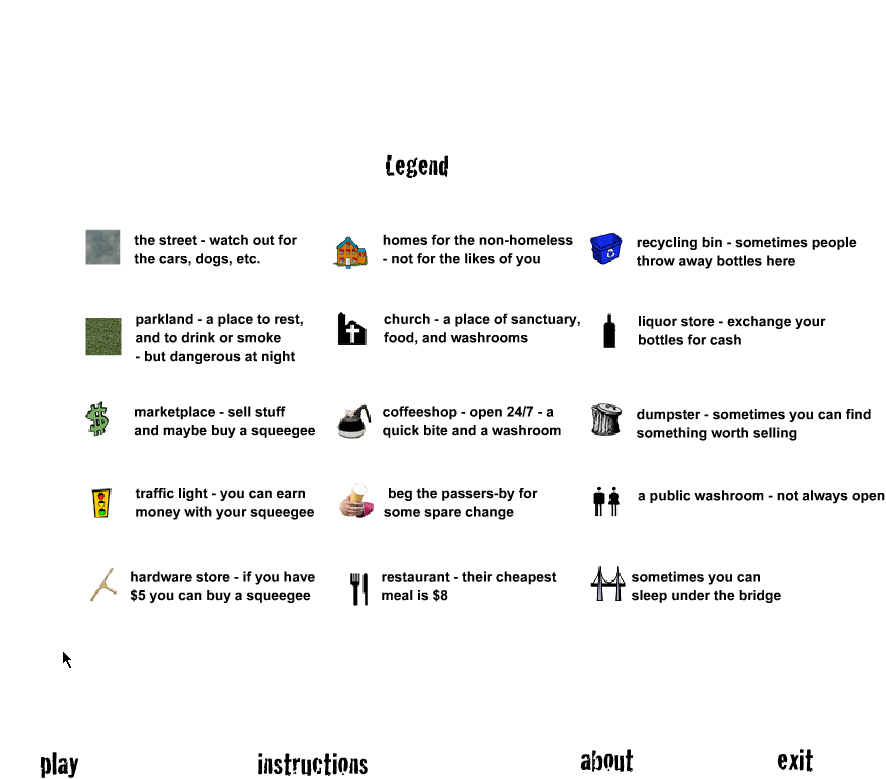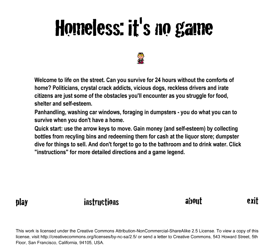 “Homeless: it’s no game” immerses you in the daily grind of a street person, guiding your character across a simplified urban grid with nothing but a pair of holey shoes and sheer determination. Movement is handled via the arrow keys, letting you traverse intersections, alleyways, and open squares in search of sustenance, shelter, and dignity. Each key press carries weight: will you dart toward the dumpster behind the restaurant, or make a beeline for the church-run soup kitchen?