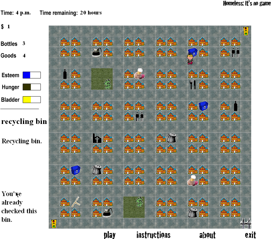 The user interface is clean and functional. Meters for Esteem, Hunger, and Bladder rest unobtrusively at the top of the screen, color-coded and easy to monitor at a glance. Interactive hotspots—dumpsters, recycling bins, markets—glow faintly when you’re in range, ensuring you’re never left guessing where to click next. While the graphics won’t win awards for flashiness, they excel at clarity and atmosphere, keeping you focused on survival rather than flashy distractions.