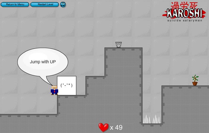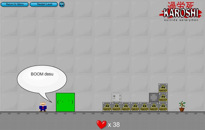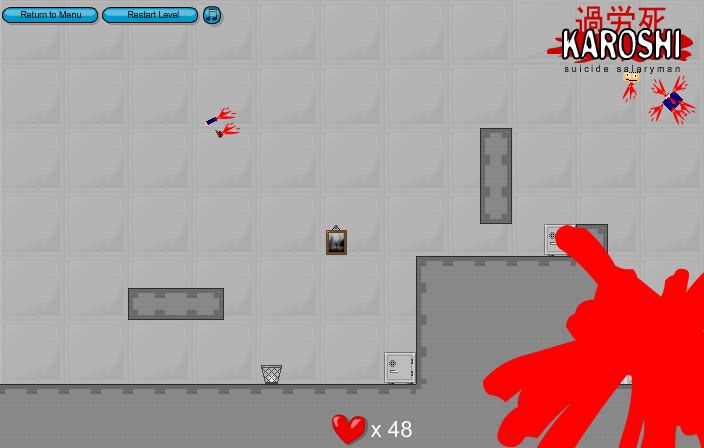 The game’s roots in the original Karoshi and Karoshi 2.0 are immediately evident. Early stages revisit classic deathtraps—simple spike pits or well-timed falls—before the design shifts into more devious territory. Later puzzles introduce moving platforms, timed turrets and block-shifting gizmos that force creative uses of the basic arrow-key controls. A handful of levels even grant you a shooting ability, letting you fire bullets that ricochet off walls or trigger remote switches—always with the caveat that you must ultimately ensure your own doom.