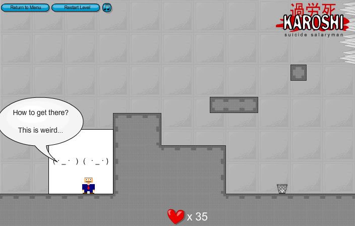 True to its Flash heritage, Karoshi: Suicide Salaryman sports a minimalist, vector-style aesthetic. Levels are rendered in crisp lines and flat colors, with hazards and platforms standing out in high-contrast against a neutral background. This visual clarity ensures you can always identify your next move—or misstep—without distraction.