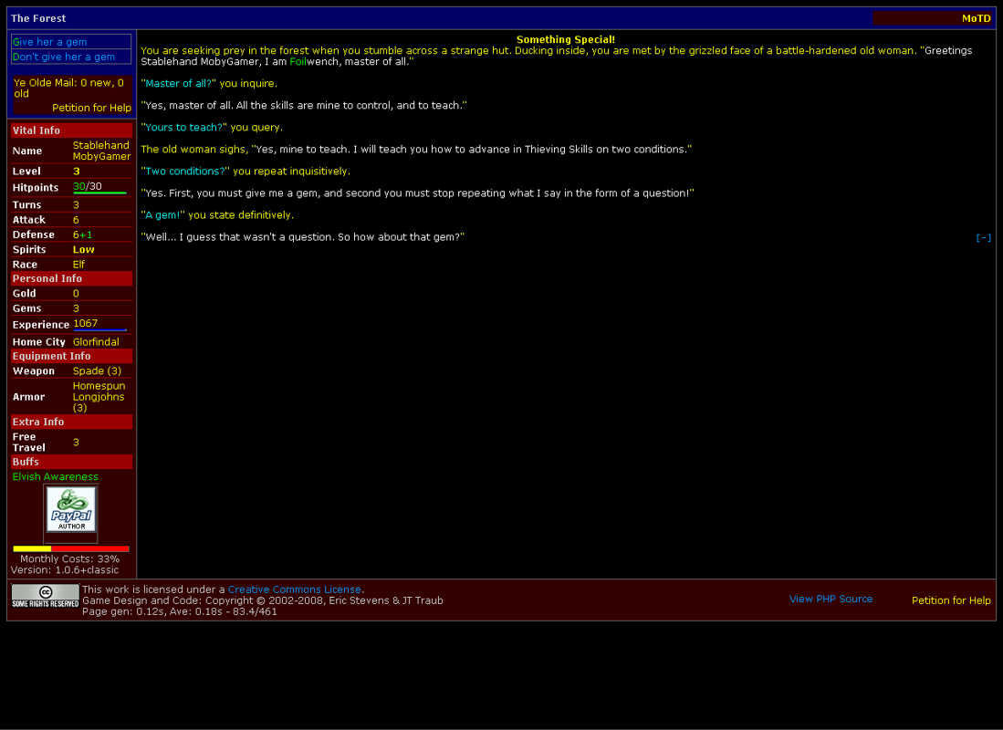 Legend of the Green Dragon revives the classic turn‐based forest‐fighting formula first popularized by BBS door games, but this time with a modern web interface and online community. Each day, you’re allotted a number of forest fights in which your hero clicks “Fight” or presses “F” to engage in random encounters. Combat is straightforward: you choose to attack, use a special ability, or attempt to flee, and the game’s number‐crunching engines resolve the outcome. A welcome addition to the original formula is the ability to commit to multiple rounds of combat automatically—5 or 10 rounds, or even “Until the End”—saving you repetitive clicks.